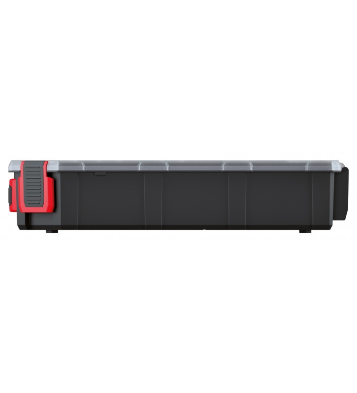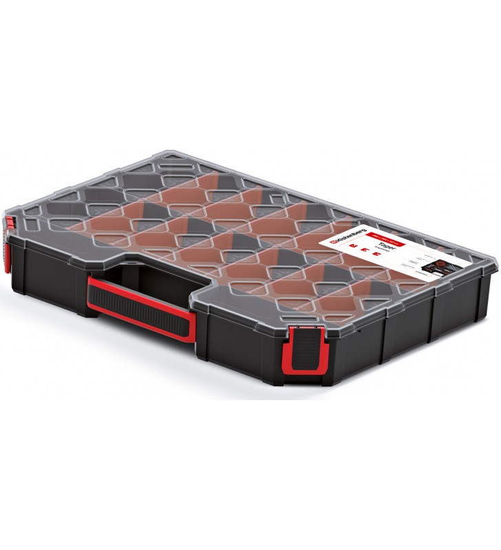 - Korpus wykonany z mieszanki polimerów o podwyższonej wytrzymałości. - Ergonomiczna rączka. - Transparentna pokrywa. - Funkcjonalne przegrody. - Wytrzymałe zapięcia.