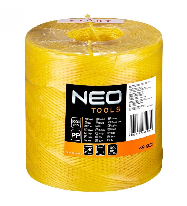 Sznurek polipropylenowy 1000 m marki NEO o długości 1000 m przeznaczony do mocowania wełny mineralnej. Sznur jest mocny, pleciony oraz odporny na zerwanie (siła rozrywająca nie mniejsza niż 40 daN). Taki sznurek z powodzeniem sprawdza się między innymi w rolnictwie (do podwiązywania roślin), transporcie (do pakowania towarów), a także jako akcesorium pasmanteryjne przy projektowaniu ubrań lub tworzeniu różnego rodzaju rękodzieła.