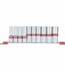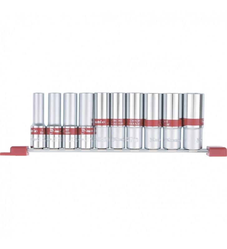 Zestaw składa się z nasadek czołowych, 6-kątnych, wydłużonych, na listwie, na kwadrat 1/2" o następujących wymiarach: 10 mm, 12 mm, 13 mm, 14 mm, 15 mm, 16mm, 17 mm, 19 mm, 21 mm i 22 mm. Materiał – CrV.
