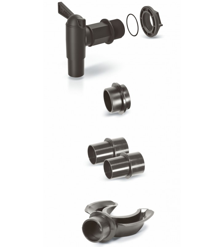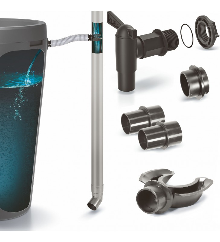 System doprowadzająco-odprowadzający wodę deszczową.Kranik jest wyposażony w dodatkową uszczelkę i nakrętke sprawia że pasuje do wszystkich zbiorników na wodę deszczową marki Waterform. Zawiera 5 elementów: reduktor; łapacz wody; kranik.