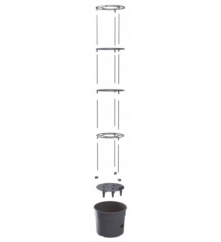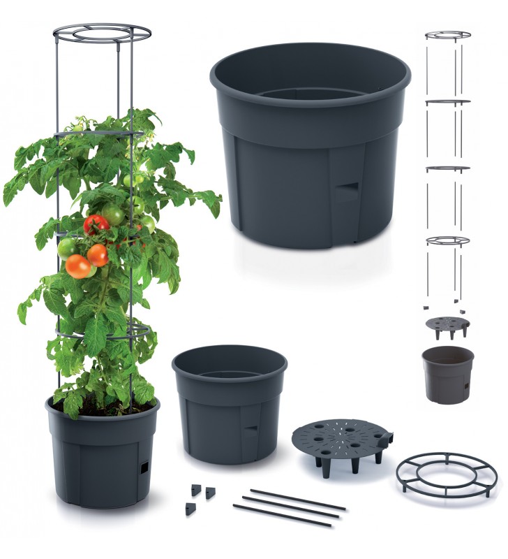Doniczka, która zapewnia optymalne warunki wzrostu pomidorowych krzewów. Zestaw wyposażony został w pierścienie, które otaczając roślinę, stabilizują plon.