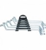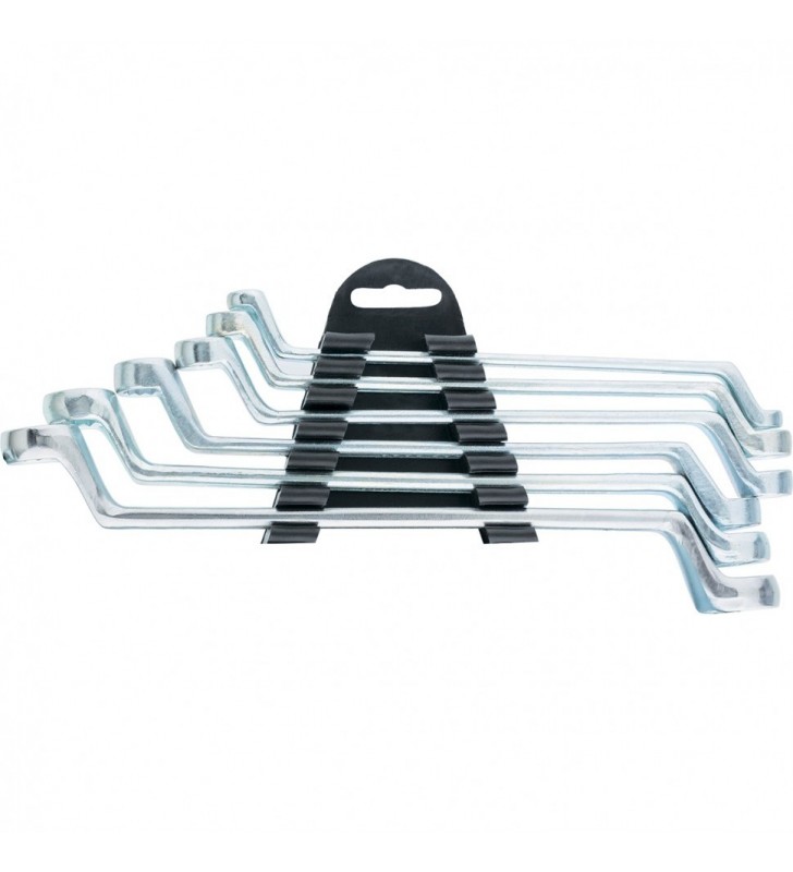 Klucze maszynowe oczkowe odgięte posiadają dwie rozwartości oczkowe o różnych rozmiarach. Profil rozwartości pierścieniowej ma 12 kątów, co zwiększa powierzchnię stykania się powierzchni roboczych i zmniejsza ryzyko deformacji ścian elementów złącznych podczas montażu. Oczkowe części robocze klucza przesunięte są względem jego Rękojeści, co pozwala wykonywać roboty w trudno dostępnych miejscach. Został wykonany ze stali węglowej. Twardość oczkowej części roboczej wynosi 41 HRC (wymogi normy GOST: 41–46 HRC). Powłoka chromowa kluczy zapewnia niezawodną ochronę antykorozyjną. Klucze zostały zapakowane w folie z polietylenu. Zestaw jest przeznaczony do montażu i demontażu połączeń gwintowych.