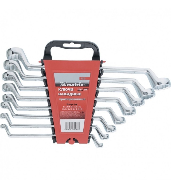 Zestaw kluczy ze stali chromowo-wanadowej. Twardość oczkowej części roboczej wynosi 44 HRC.