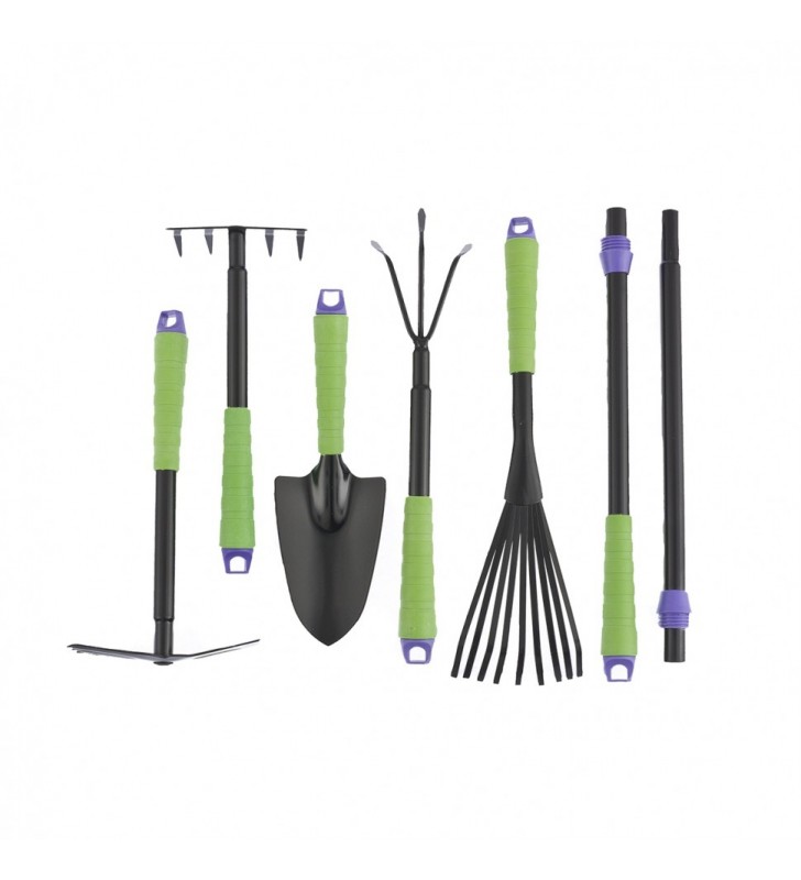 Zestaw narzędzi ogrodowych z dwoma zdejmowanymi uchwytami wydłużającymi, przeznaczony do prac w zakresie pielęgnacji roślin, kwiatów, małych krzewów.