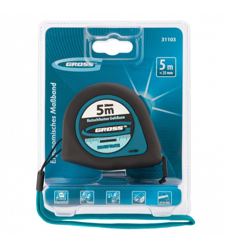 • Ergonomiczna obudowa przymiaru taśmowego wykonana jest z tworzywa ABS (wykorzystane surowce BASF), które zachowują zdolność mechanizmu do pracy przy upadku z wysokości do 1,5 m.