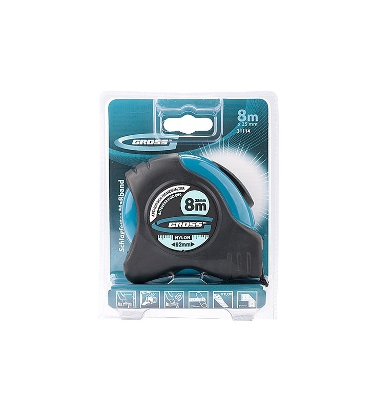 • Ergonomiczna obudowa przymiaru taśmowego wykonana jest z tworzywa ABS (wykorzystane surowce BASF), które zachowują zdolność mechanizmu do pracy przy upadku z wysokości do 1,5 m.