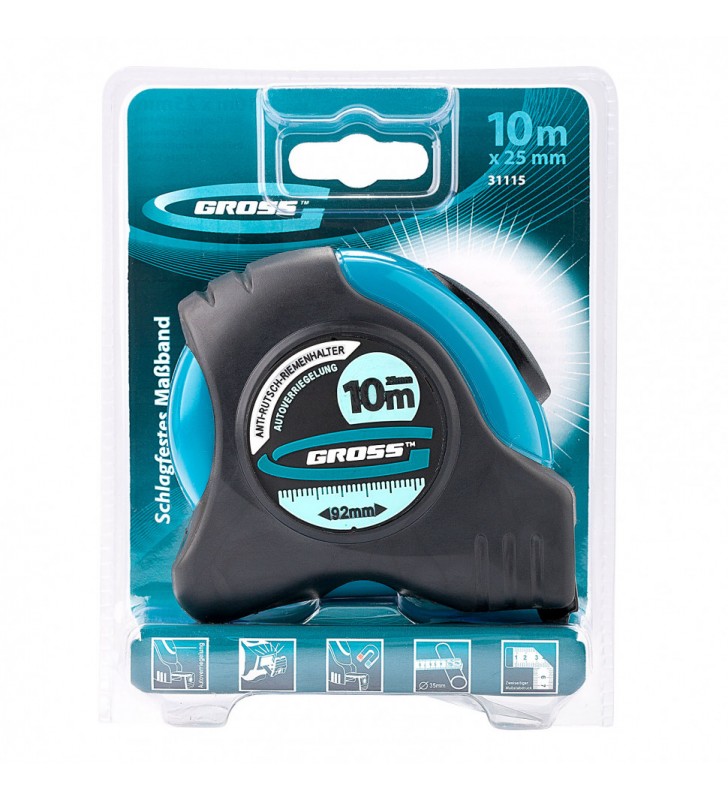 Ergonomiczna obudowa przymiaru taśmowego wykonana jest z tworzywa ABS (wykorzystane surowce BASF), które zachowują zdolność mechanizmu do pracy przy upadku z wysokości do 1,5 m.