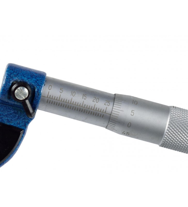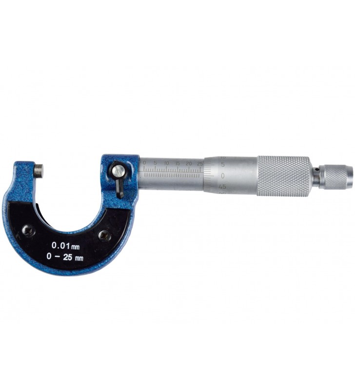 Precyzyjny mikrometr analogowy do pomiarów zewnętrznych z dokładnością do 0,01 mm. Działanie przyrządu opiera się na użyciu śruby mikrometrycznej oraz noniusza. Precyzyjna śruba mikrometyryczna o skoku gwintu 0,5 mm, połączona z bębnem mikrometru. Na jego obwodzie wygrawerowano podziałkę (noniusz). Sprzęgło zapadkowe połączone z bębnem mikrometru zapewnia odpowiedni, stały docisk szczęk.