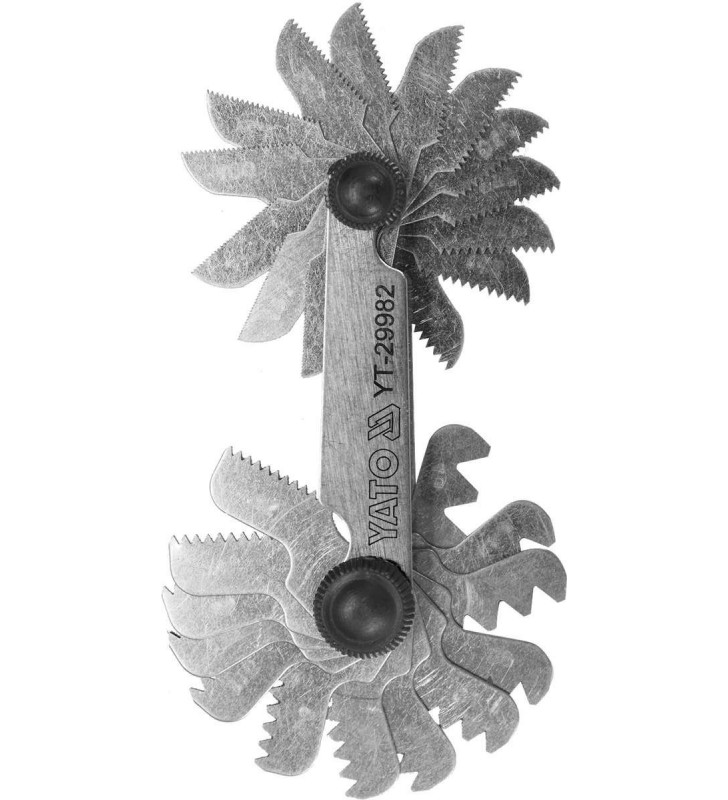 Sprawdzian z hartowanej blachy stalowej. Wyposażony w 28 wzorców wewnętrznych i zewnętrznych typu WHITWORTH 55°, 4 - 62 BSW.
