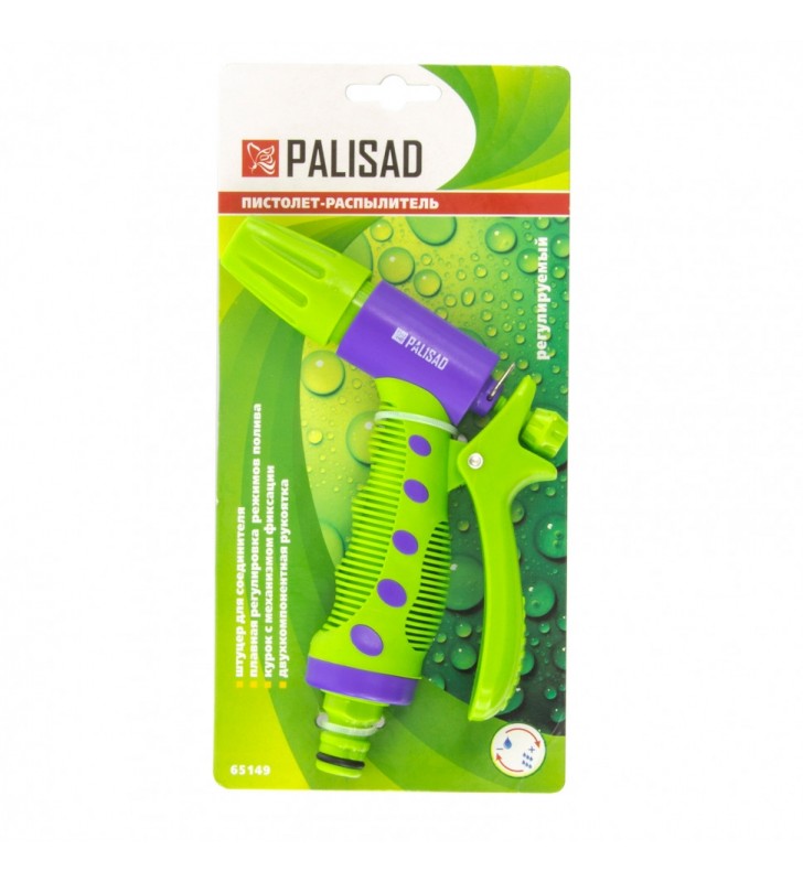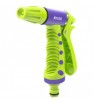 Pistolet natryskowy z osadzeniem króćcowym i wygodnym spustem umieszczonym z tyłu. Wyposażony w regulowaną dyszę, co zapewnia trzy tryby nawadniania: strumień sztywny, strumień typu "mgła", strumień stożkowy. Posiada blokadę spustu do pracy ciągłej.