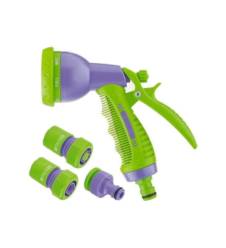 Rozpylacz, materiał: trwałe tworzywo ABS. Dzięki regulowanej głowicy ma sześć trybów nawadniania: prysznic, mgła, strumień stożkowy, strumień centralny, strumień płasko-poziomy, strumień twardy, co pozwala wybrać najbardziej odpowiedni tryb do każdego rodzaju nasadzeń, jak również do czyszczenia. Posiada blokadę spustu do pracy ciągłej.