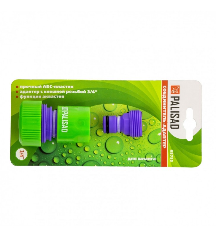 Szybkozłączka z zaworem "autostop" (do zatrzymania doprowadzenia wody) do węża 3 4 wykonana z wytrzymałego tworzywa ABS. W skład zestawu wchodzi adapter z gwintem zewnętrznym 3 4. Zestaw pozwala podłączyć wąż o średnicy 3 4 ze strony złącza do zaworu (rury wodociągowej, rozdzielacza) o średnicy gwintu wewnętrznego 3 4 ze strony adaptera. Zestaw przyłączeniowy – adapter z przejściówką do króćca i szybkozłączka z zaworem "autostop" – wykonany z odpornego do uderzeń tworzywa ABS. Średnica osadzenia do szybkozłączki do węża 3 4, gwint zewnętrzny adaptera o średnicy 3 4. Wyjście z króćcem adaptera jest kompatybilne ze wszystkimi elementami systemu nawadniania Palisad.