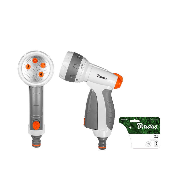 Pistolet 5-funkcyjny wykonany z metalu. Pozwala podlewać różnymi strumieniami wody. Wyposażony w innowacyjną dźwignię do płynnej regulacji siły strumienia wody.