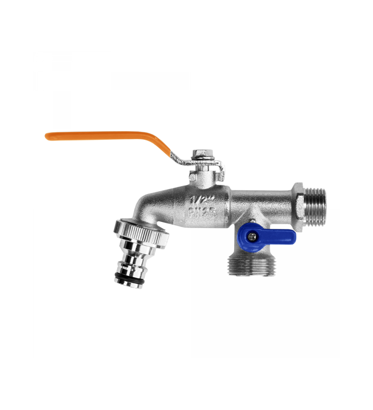 Kran kulowy GZ1/2", 2x wyjścia GZ 3/4" + nypel do szybkozłączki