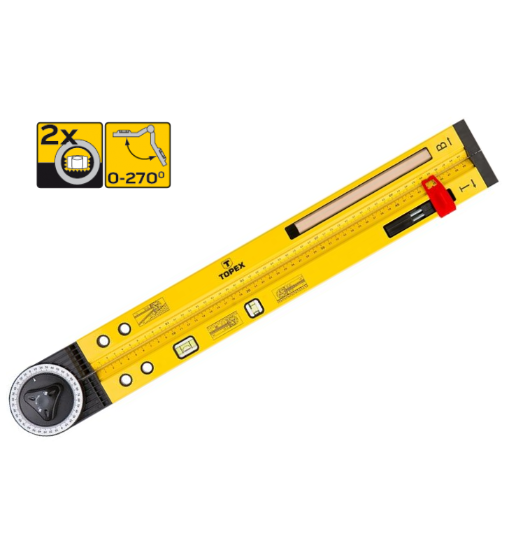 Kątomierz nastawny TOPEX to narzędzie łączące kilka przyrządów pomiarowych. Posiada kątomierz o zakresie mierzenia 0°- 270°, poziomnicę o długości 500 mm z dwoma libellami, przymiar liniowy o długości 50 cm, możliwość przymocowania ołówka stolarskiego, dzięki czemu może służyć jako cyrkiel. Śruba zaciskowa ułatwia dokonywanie pomiaru kąta.