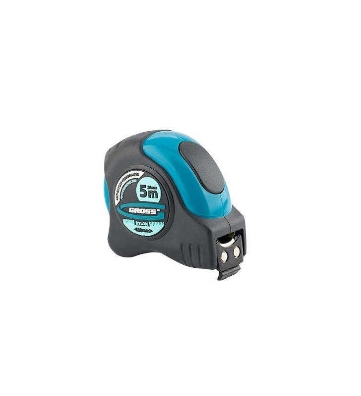 Przymiar taśmowy Schlagfest marki GROSS należy do kieszonkowych taśm mierniczych z automatyczną blokadą taśmy pomiarowej. Służy do pomiarów odległości do 5 m. Ergonomiczna dwuskładnikowa obudowa przymiaru taśmowego wykonana jest z tworzywa ABS (wykorzystane surowce BASF). Łatwy w obsłudze i nie ślizga się w dłoni. Dwustronna taśma pomiarowa przymiaru taśmowego o szerokości 25 mm ma nylonową powłokę ochronną. Podstawa taśmy pomiarowej jest wyposażona w powlekany gumą zaczep magnetyczny True Zero (prawdziwe zero), który pozwala nie tylko na blokadę na powierzchniach równych, lecz również na rurach o średnicy do 35 mm. Ruchomy zaczep True Zero pozwala na precyzyjne pomiary od zera w przypadku pomiarów zewnętrznych i wewnętrznych.