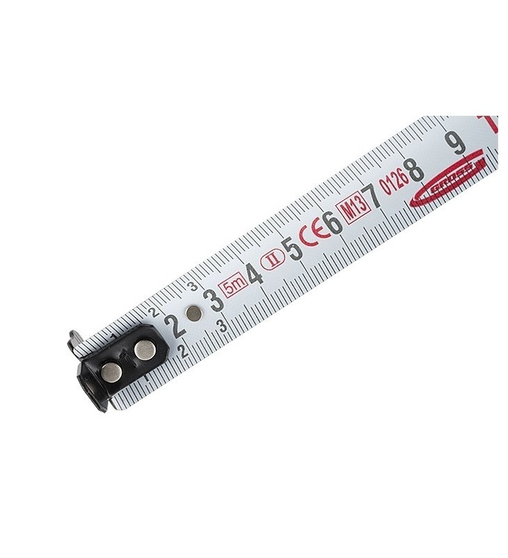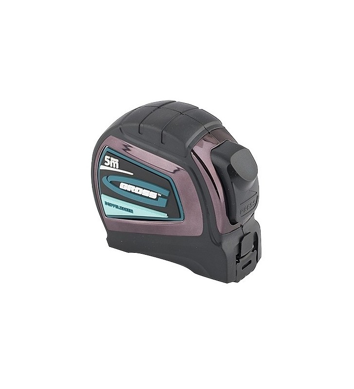 Przymiar taśmowy Doppelhaken marki GROSS, długość taśmy 5 m, szerokość 19 mm. Połączenie tworzywa ABS i gumy termoplastycznej pozwala nachować zdolność do pracy przy gwałtownych zmianach temperatury, a także przy upadku z wysokości do 1,5 m. Taśma miernicza z podwójnym zaczepem posiada dodatkowe pokrycie z nylonu, które chroni pas metalowy przed ścieraniem i działaniem środowiska. Sprężyna powrotna ze stali węglowej posiada niezbędną elastyczność i trwałość. Przymiar taśmowy posiada automatyczną blokadę taśmy pomiarowej, co zapewnia dodatkową wygodę w pracy.