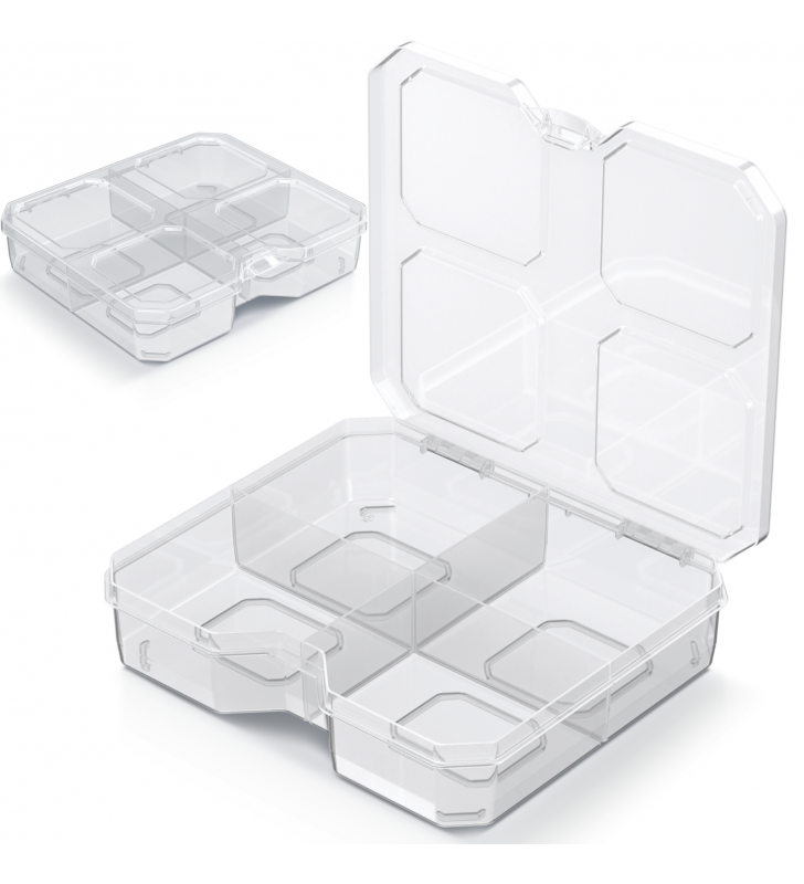 Wygodny i uniwersalny pojemnik na domowe drobiazgi, akcesoria wędkarskie, śrubki, leki, półprodukty do wyrobu biżuterii, a także do przechowywania zużytych baterii czy innych małych przedmiotów, które chcielibyśmy zachować w porządku. Transparentna pokrywa ułatwia łatwy i szybki dostęp do produktów. Pozwala ona sprawdzić zawartość bez konieczności otwierania.