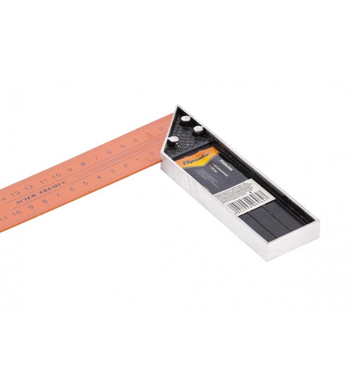 Uniwersalny kątownik stolarski metalowy z malowaną powierzchnią i dwustronnymi oznaczeniami.