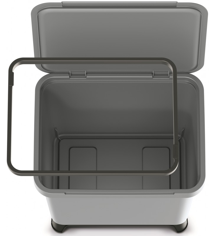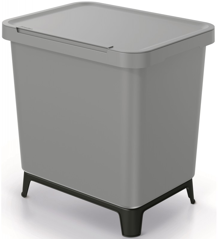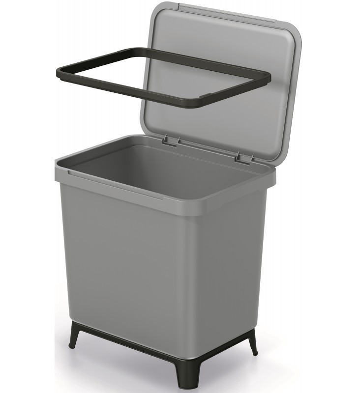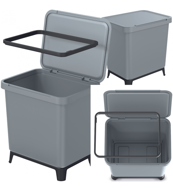 Wykonany z materiału pozyskanego z recyklingu. Idealne rozwiązanie do miejsc o ograniczonej przestrzeni. Kosz został wyposażony w designerską, uchylną pokrywę oraz funkcjonalną ramkę, dzięki której worek jest stabilnie umocowany i nie zmienia położenia. Model kosza, który prezentujemy na tej aukcji posiada zdejmowaną podstawę z nóżkami. Posiada modułową formę i regularne kształty co sprawia, że można go ustawić w dowolnej konfiguracji, dopasowując je do wymiarów szafki lub szuflady.