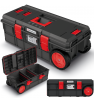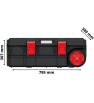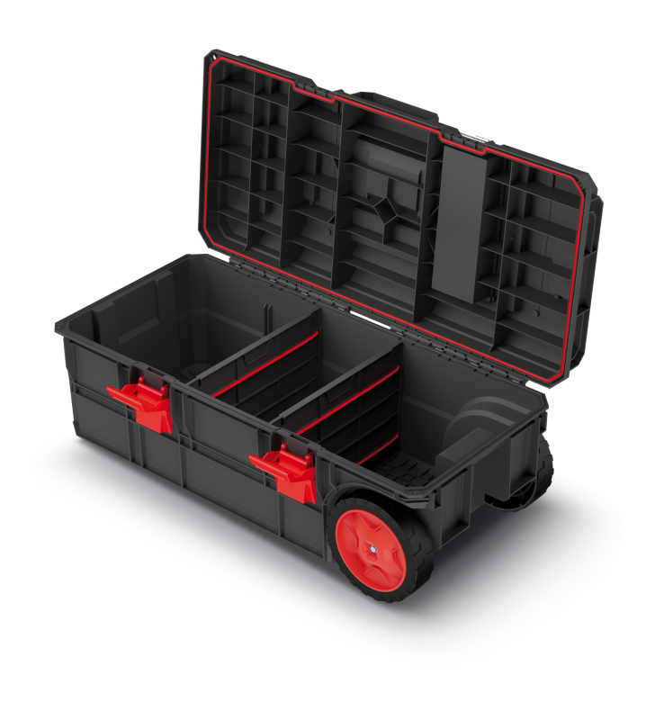 Wytrzymała skrzynia narzędziowa na kołach, która sprawdzi się w każdych warunkach. Została wykonana z najwyższej jakości mieszanki polimerów, zapewniając tym jakość oraz niewyobrażalną wytrzymałość produktu. Poświadcza to, że skrzynia może służyć jako podest roboczy, który wytrzyma obciążenie sięgające do 120 KG! Ładowność owej skrzynki to 50 KG, co umożliwia transport najcięższych narzędzi. Metalowe zawiasy, a co najważniejsze solidne bieżnikowane koła z elastomeru zapewniające poprawę równowagi oraz wyższy komfort prowadzenia skrzyni przy obciążeniu.