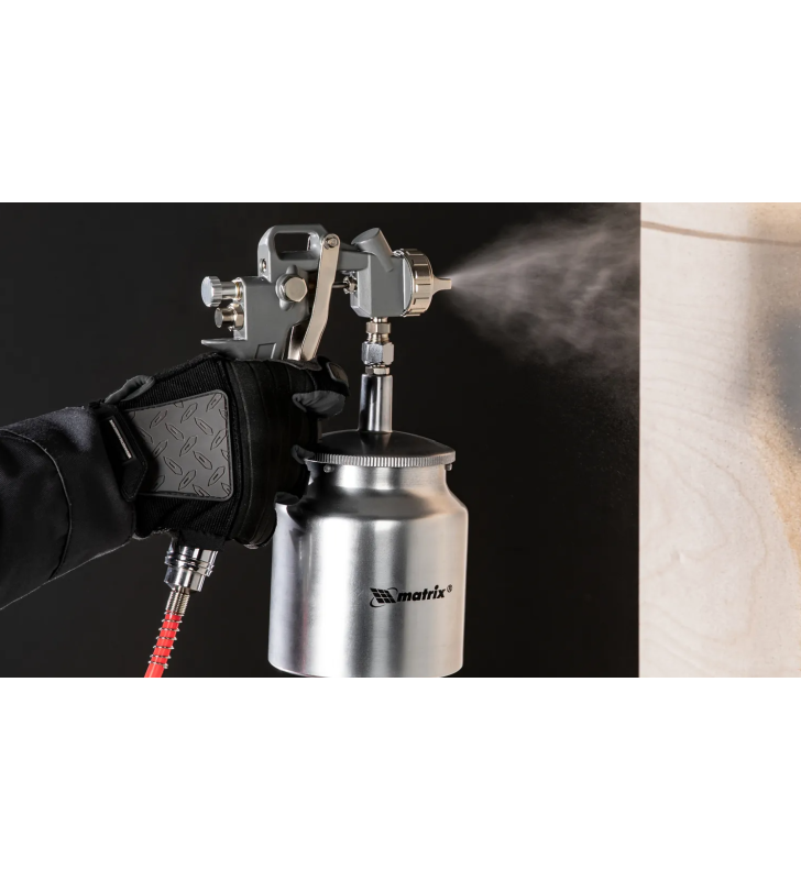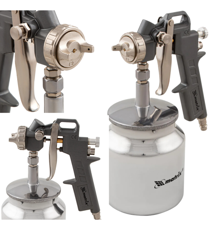 Pneumatyczny agregat malarski marki MTX z dolnym zbiornikiem 0,75 L i dyszami o średnicy 1,2, 1,5 i 1,8 mm służy do malowania powierzchni metalowych, drewnianych, ceramicznych i tworzyw sztucznych. Dzięki wymiennym dyszom opryskiwacz może pracować z kompozycjami o różnej gęstości: lakierem, kitem, farbą. Przydaje się na budowie, w warsztacie samochodowym oraz przy produkcji mebli.