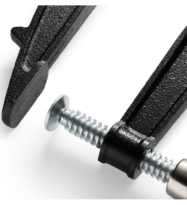 - Stalową prowadnicą z nacięciami, które ułatwiają utrzymanie ramienia zaciskowego w odpowiedniej pozycji co zapobiega ześlizgiwaniu